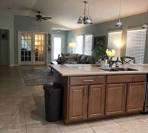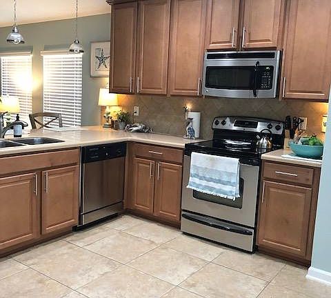Beautiful 4 BR 2 BA home in prestigious Venetian Bay! OPEN FLOOR PLAN, Vaulted ceilings, upgraded stainless steel appliances, Silestone counter tops, large tiled living area and carpet in bedrooms. Beautiful french doors lead into BR #4, which can also be utilized as an office. Large walk in closets, Tray ceiling in master, master bath has large soaking tub and shower. Fully fenced back yard, custom brick back porch and rear entry 2 car garage. 1700 sqft living area, 2,007 total. Only 7 miles from the Beach. Monthly lawn care is included in rent. Tenant responsible for utilities. Pets will be considered with an additional pet deposit.