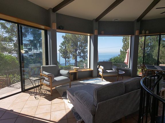 PLEASE NOTE: Due to Palisades Fire we have no power and we do not know when we will be able to have it cleaned and there will be access. A beautiful 2bd/1bth 1500sqft home with spectacular ocean views. The best location in Malibu - one minute from PCH via a private gated road in Eastern Malibu, but close to Central Malibu and only 15 minutes to Woodland Hills. Perfect for a single professional or couple. The light filled top floor features an open floor plan with kitchen, bathroom with double sink, shower, and tub and living room area and bedroom. The lower level is split with a large bedroom or office on one side and laundry / storage / recreational room, office (or even garage) on the other. Plenty of storage. Surrounded by beautiful trees the outdoor areas include a private outdoor shower, an enclosed side yard and large patio perfect for outdoor relaxing while you watch the ocean or see the lights from Santa Monica bay. Available furnished or unfurnished. Pets considered. Lessor is responsible for all utilities. Gardener included.