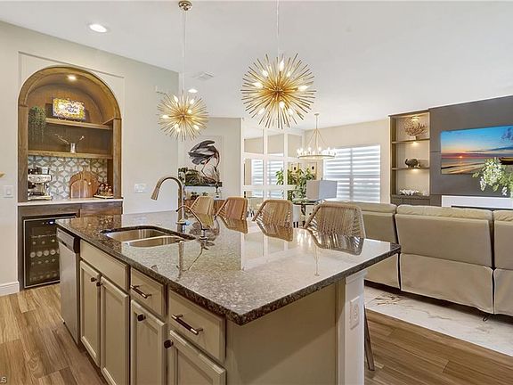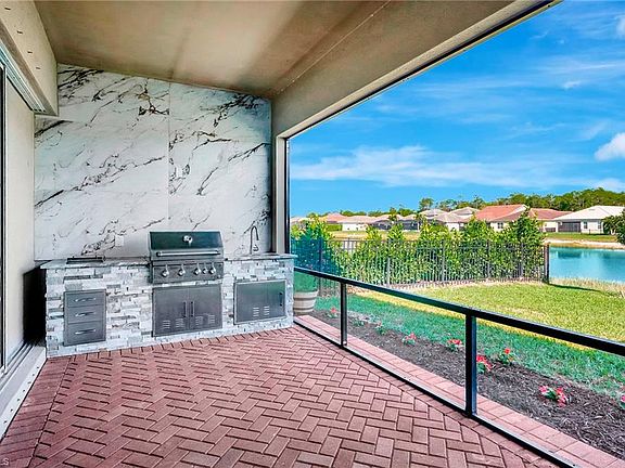 Discover this stunning, elegantly crafted one-story ranch-style residence in a desirable gated lake-view community in North Naples. Spanning 2,380 sq. ft., this home boasts a spacious and functional layout perfect for entertaining, featuring a large great room, 3 bedrooms plus a den, 2.5 bathrooms, and a 2-car garage. The interior showcases exquisite Italian-style marble tile flooring throughout, a customized mirror wall, and thoughtful upgrades to rooms, kitchen, cabinets, faucets, and light fixtures—all reflecting the owner’s significant investment. The master suite is a retreat, complete with an oversized walk-in shower and built-in closet organizers. The kitchen impresses with a stunning granite island and an Italian-style coffee station. Step outside to enjoy a built-in outdoor kitchen equipped with a grill, side burner, and sink—ideal for al fresco dining. Additional highlights include an extra-large storage attic for ample space. Residents of this new community enjoy access to a clubhouse featuring a club room, exercise room, community pool, spa, and children’s play area. Nestled within an A+ school district, the home is surrounded by premier entertainment and dining options, including Founders Square and Logan Landing. Convenience is key, with a hospital just 1.5 miles away, proximity to I-75, and easy access to Mercato, Waterside Shops, and Gulf beaches. This is a rare opportunity to own a luxurious, move-in-ready home in an exceptional location!