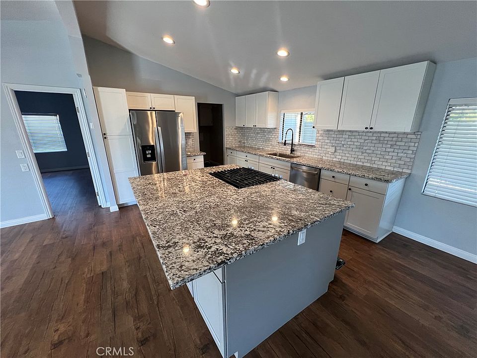 This recently renovated single-story residence offers a highly desirable open floor plan with three bedrooms and two full bathrooms. The interior features wood flooring throughout and fresh, neutral paint, creating a cohesive and modern living environment. The living area is centered around a fireplace, providing both comfort and visual appeal.