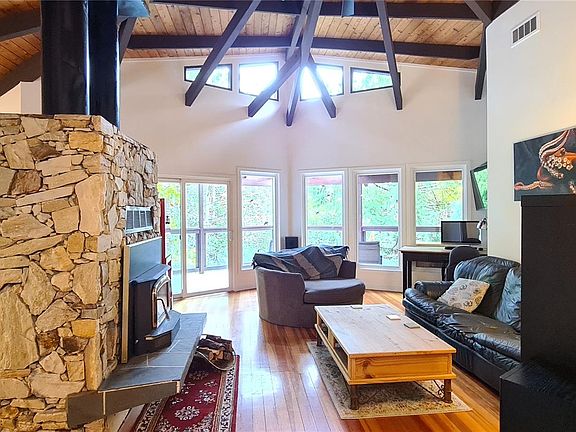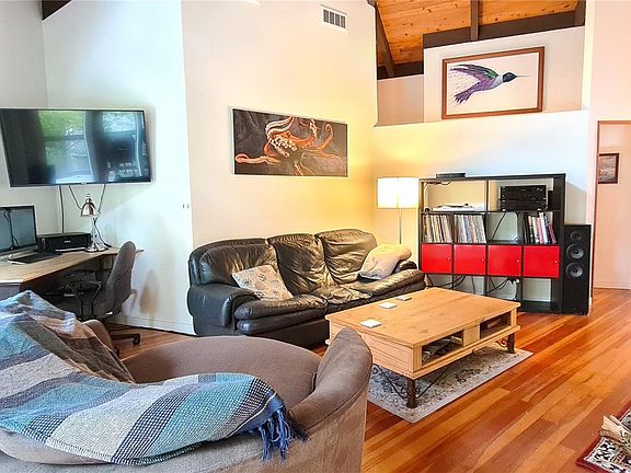 Vaulted ceilingsPost and beam constructionNestled amongst the treesSingle-level livingLarge and bright lotFirst growth fir flooringCozy and inviting home