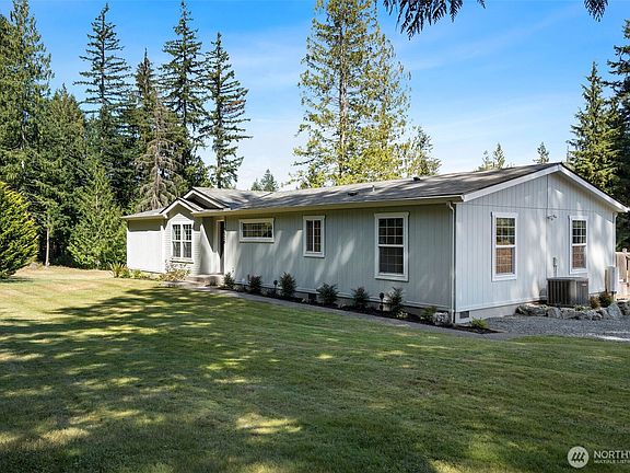 Light-filled, fully remodeled 3-bedroom 2-bathroom rambler on nearly 5 rolling acres. Open floor plan with vaulted ceilings, abundant windows, and a sliding door to a large entertainment deck. Gorgeous new kitchen with white cabinetry, quartz counters, a large island, and stainless steel appliances. Spacious living, dining, and family rooms. Primary suite with dual-vanity bath plus two more bedrooms and a full bath. Updates include plumbing, wiring, furnace, heat pump/AC, new roof, blinds, appliances, lighting, and leaf filter gutters. Detached oversized 2-car garage, carport, 12x12 shed, and full RV hookup. Private, peaceful setting close to amenities.