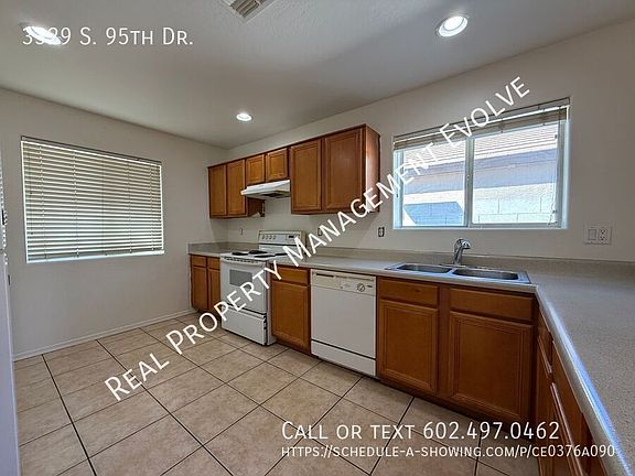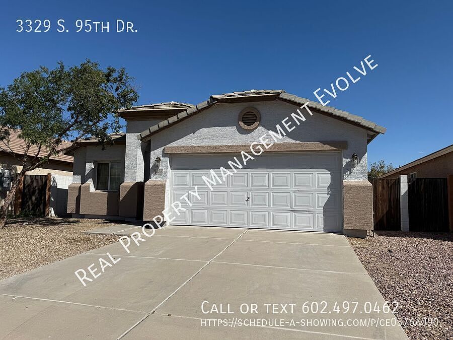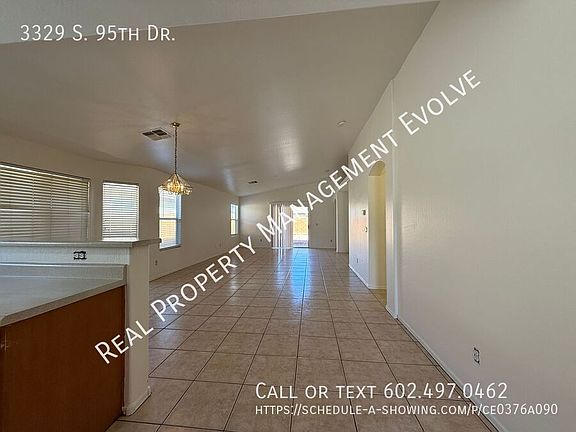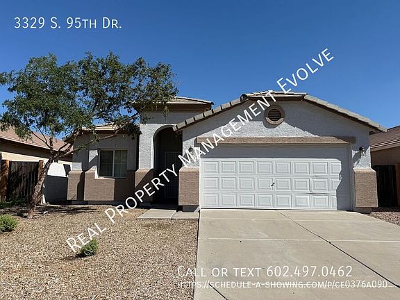 Spacious 4-bed / 2-bath home in Tolleson has BRAND-NEW CARPET and is move-in ready! Large family room and formal dining room. Kitchen has ample cabinet-space, breakfast bar, and pantry. Primary bedroom boasts a split floorplan with a bay window and ensuite bathroom featuring dual sinks and walk-in closet with built-in shelving. Separate laundry room includes a washer and dryer. Attached 2-car garage and big backyard with a covered patio and low-maintenance gravel landscaping. Schedule a tour!