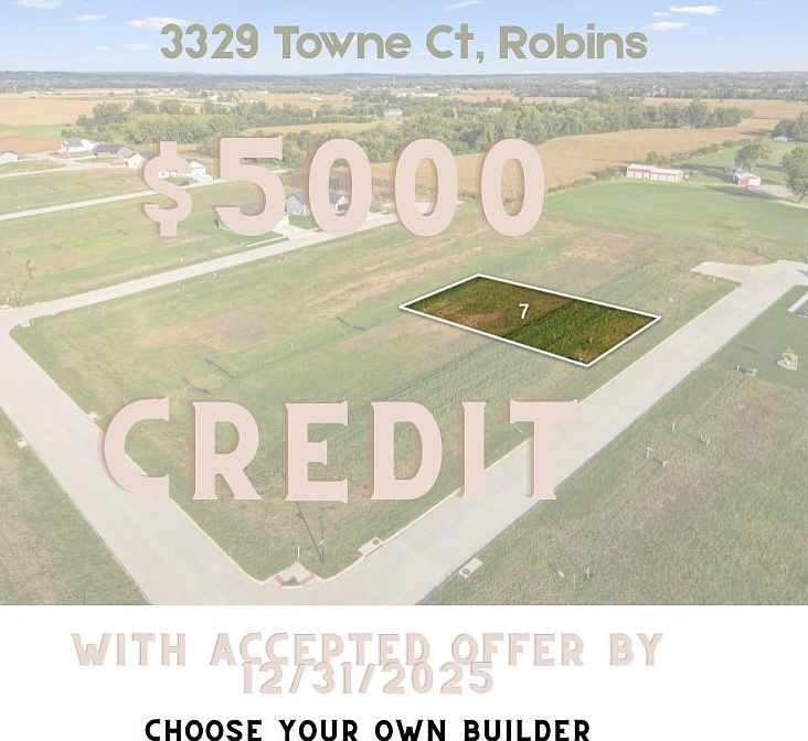 Build Your Dream Home in the Village of Robins! We will give you a $5,000 credit with acceptable offer closes by Dec 31,2025! Welcome to a brand-new development in the heart of Robins, perfectly situated near Robins and Alburnett school districts. This walkout lot offers the flexibility to pick your own builder, with ranch homes requiring 1,350+ sq ft and two-story homes starting at 1,850+ sq ft. Enjoy quick access to Robins, Marion, Hiawatha, and Cedar Rapids, an ideal location for work or play. $100/year HOA covers detention area maintenance and mowing. Utilities: Linn County REC electric, MidAmerican gas, City of Robins sewer, City of CR water, and USA Communications internet
