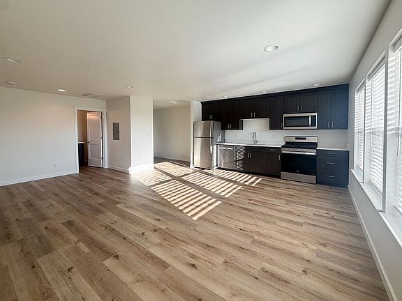 This top-floor studio ADU home features a welcoming kitchen equipped with stainless steel appliances, including a refrigerator, stove/oven, dishwasher, and microwave. The spacious floor plan offers a great room concept for living and dining, a tall pantry cupboard, and abundant natural lighting. Additionally, the unit includes a full-size stackable washer/dryer, and beautiful finishes such as granite counters and sleek cabinetry.