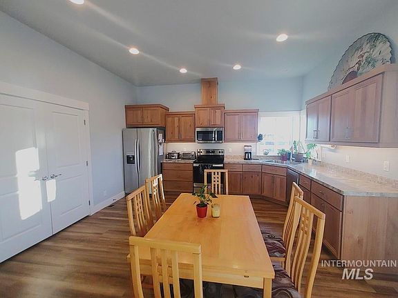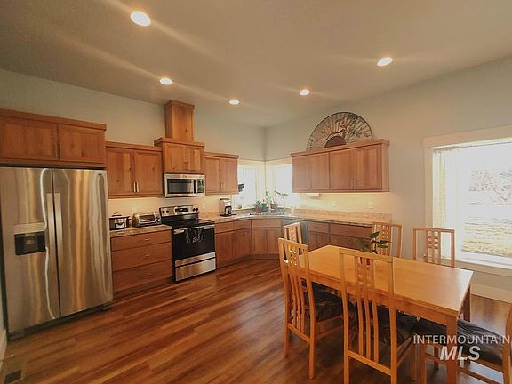 RIVER Frontage!! Custom, high energy efficient home with quality boasting throughout. Attached 3 car garage with workshop space, cabinetry, and shelving. Inviting entry with french doors leading to office, split bedroom design, and spacious great room. Kitchen features beech wood cabinets with color matched LVP flooring, oversized windows to enjoy the river view. Great entertainment space with the covered patio, fire pit, and direct river access for fishing. Room for animals, existing chicken coop, garden space, fruit trees, berry bushes, and underground pressurized irrigation. This is a rare find and it's only a hour to Boise.