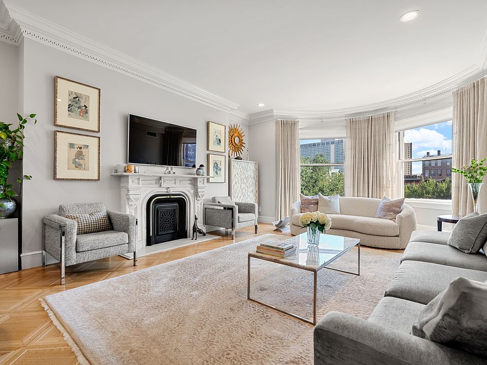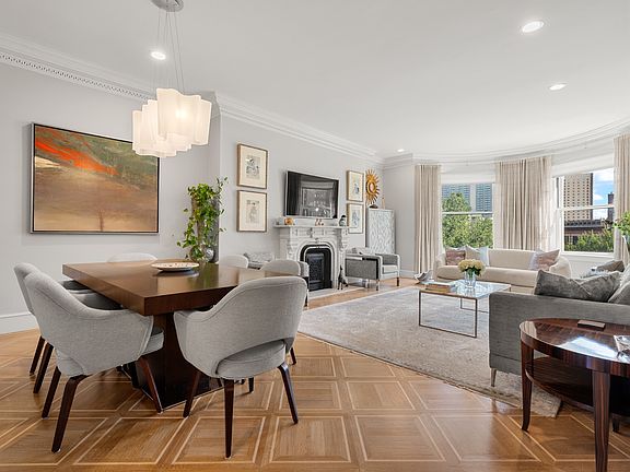 This rarely available, front facing unit overlooking the Commonwealth Avenue Mall is in an iconic limestone building that offers part-time concierge, deeded garage parking with an electric vehicle charger, and additional storage. This elegant and sophisticated home has beautiful designer finishes and rooms of a grand scale. The sunny living/dining area has a large bay window with views of the Back Bay, oak herringbone floors, and a fireplace with an antique marble mantle. The newly renovated kitchen has custom walnut veneer cabinets and leathered Vermont Danby marble counters and back splash. There is a Wolf induction range, Sub-Zero refrigerator/freezer, and a Miele dishwasher. The grand primary suite has city views, a wall of incredible closets, and a marble bath with a large shower. There is a large guest room with built-in bookcases and an en-suite bath. The third bedroom makes a great office/guest bedroom. The elevator is new, and roof and roof deck are currently being replaced and have been paid by the seller.