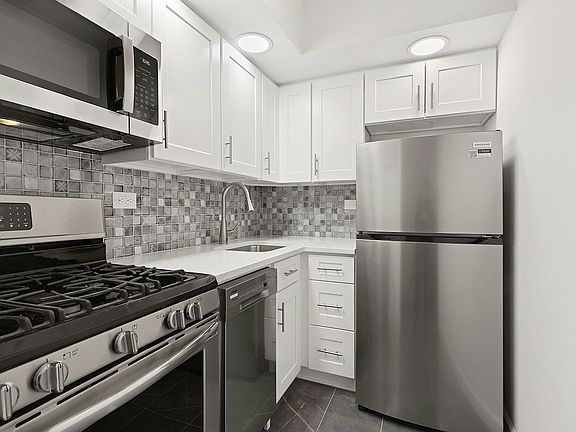 The kitchen features all-new stainless steel appliances, beautiful new cabinetry with generous countertop space as well as new tiled floor, backsplash and lighting. The bathroom features a modern vanity with mirrored cabinet, tiled floor and fully re-glazed tub. There is also an inviting entry foyer, large double closet and a coat closet and newly refinished hardwood floors throughout. A special nook in the living room offers the perfect opportunity for a dedicated work space.