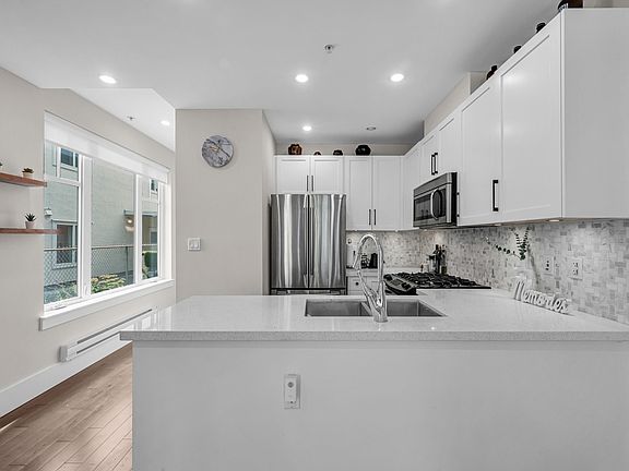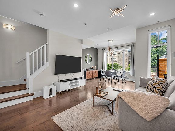 Corner townhomeModern livingOpen-concept main floorEngineered hardwood flooringLarge windowsContemporary kitchenCustom cabinetry