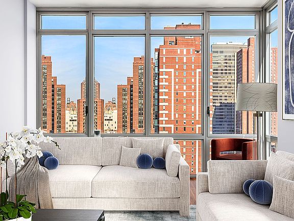 Immerse yourself in stunning views from this expansive three-bedroom, three-bathroom apartment at The Azure. The home is awash in natural light through 10-foot ceilings and floor-to-ceiling windows, offering a sweeping view of the New York skyline.