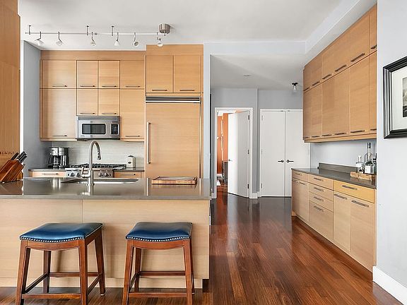 An open-plan kitchen and a 37-foot-long great room offer a perfect setting for entertaining. The kitchen in equipped with Viking and Bosch appliances, top-tier cabinetry, and a Caesarstone breakfast bar. The Primary suite is equipped with a spacious walk-in closet and a spa-like bathroom finished with Blue de Savoie and Stellar White marble. The ample second bedroom offers captivating views of the northern East River. The en-suite windowed private bathroom is equipped with Zebrano Bianco porcelain and a Zuma soaking tub. Other highlights include a stackable Bosch washer/dryer and a multi-zone central heating and cooling system.