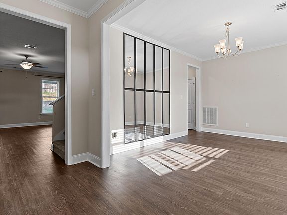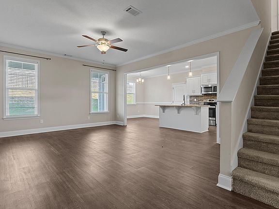 The downstairs features an open-concept living room, formal dining, kitchen, breakfast nook, and half bath, perfect for everyday living and entertaining. The kitchen shines with white cabinetry, granite countertops, a large island, two pantries, a coffee bar/flex/prep counter and plenty of natural light. A separate formal dining room (or flex space) gives you options for an office, playroom or additional living area. Hardwood style flooring throughout the main level makes the space both elegant and easy to maintain.