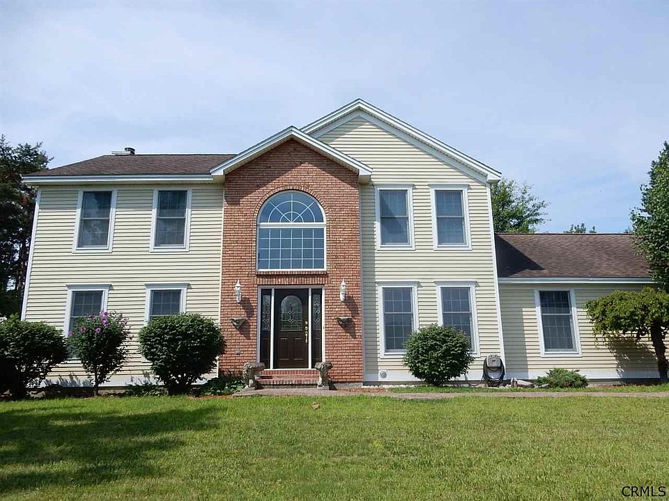 Beautiful home perched on 2 private acres offering great views. Cherry Kitchen opens to great room w/ fireplace. Spacious bedrooms, walk-in closet in master, and optional 1st floor bedroom. Large private back yard with finished patio. Taxes reflect basic star.