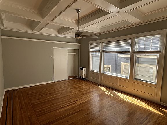 This spacious and bright studio blends classic architectural charm with modern upgrades. Featuring stunning coffered ceilings, gleaming hardwood floors, oversized windows for natural light, and a ceiling fan for year-round comfort. The newly remodeled kitchen includes quartz counters, stainless steel appliances, gas range, and sleek white cabinetry. The updated bathroom features a pedestal sink, modern fixtures, and elegant marble-style tilework. Enjoy access to a shared backyard garden, a serene outdoor escape right at home.
