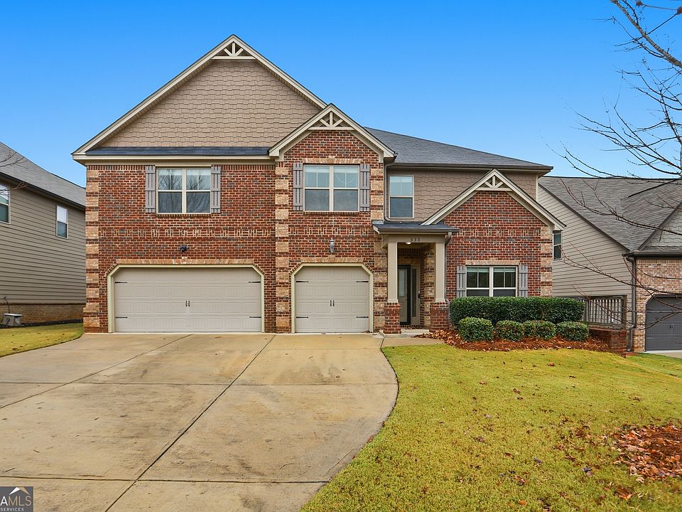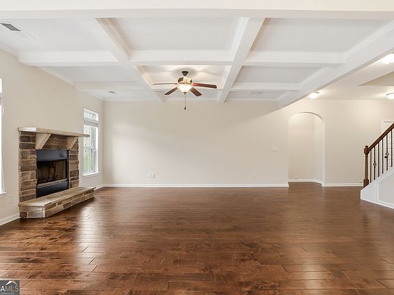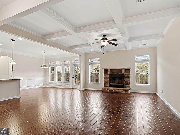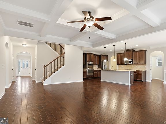 Stunning 5 bed, 3.5 bath home featuring fresh interior paint and new carpet. The first-floor primary suite complements an open living room with coffered ceilings and a stone fireplace. Enjoy a chef's kitchen with a gas cooktop, double ovens, a large island, and wood flooring throughout. Beautiful touches include wainscoting in the breakfast room, arched doorways, and vaulted bedroom ceilings. Private backyard completes this impressive home.