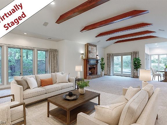 Desirable PORTAGE WOODS is a small enclave nestled amongst lush landscaping. Sept 2025 removed wallpaper & freshly painted in: Great rm, hall, foyer, laundry & guest BA. Sept 2025 new carpet: Grt rm & BR. A wrought iron gate welcomes you to a brick walkway and leads to a covered front porch. The grand foyer w/parquet flooring & walk-in closet leads to double glass French doors into the great room. The centerpiece of this spacious home is the large great room which is open to a morning room (informal eating area) and kitchen. Great room features a brick wood burning fireplace w/brick hearth and wood mantle, beamed ceiling w/recessed lighting and sliding door to patios. Plenty of space for a formal dining area can be found in the great room. The morning room has 3 walls of windows overlooking lush gardens. The remodeled kitchen has painted wood cabinets, granite countertops & subway tile backsplash, large island w/storage, built-in pantry with pull out shelves, parquet flooring and black Samsung glass cooktop w/exhaust hood, dishwasher, French door refrigerator w/water & ice in door, microwave & oven. Library has dark cherry bookshelves, drawers & desk along one wall, crown molding & recessed lights. Versatile office (parlor) has built-in bookshelves/cabinets & crown molding. First floor primary bedroom has sliding doors to private brick patio & gardens and abundant space in the walk-in closet. Updated primary bathroom has a double vanity w/cherry cabinetry, granite countertop, ceramic tile floor, walk-in ceramic tiled shower with glass door. Close by is the first floor laundry with washer, dryer, sink & cabinets. Dramatic guest half bath completes the first floor. Second floor offers two spacious bedrooms w/multiple closets & storage plus full bath. The outdoor area has multiple brick patios & walkways w/stone steps all surrounded by brick wall, mature trees & gardens for relaxing or outdoor entertaining. Oversized 2 car attached garage has lots of storage area.