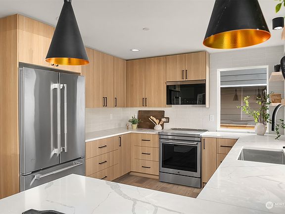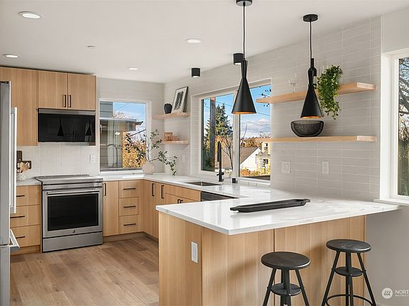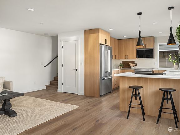 United Seattle presents this modern new home in the West Woodland area of Ballard. Main floor hosts your functional kitchen with complete appliance package & quartz counters. Easy flow into living room for entertaining, complemented by powder room, perfect for guests. Second floor includes two bedrooms plus full bath. On the top floor, find your primary suite with spacious bath and walk-in closet, plus laundry room. Roof deck provides low-maintenance outdoor space with expansive territorial views. Ample mini splits throughout for zoned comfort. Conveniently located near the Brewery District, plus the many amenities downtown Ballard and Phinney Ridge. Assigned off-street parking.