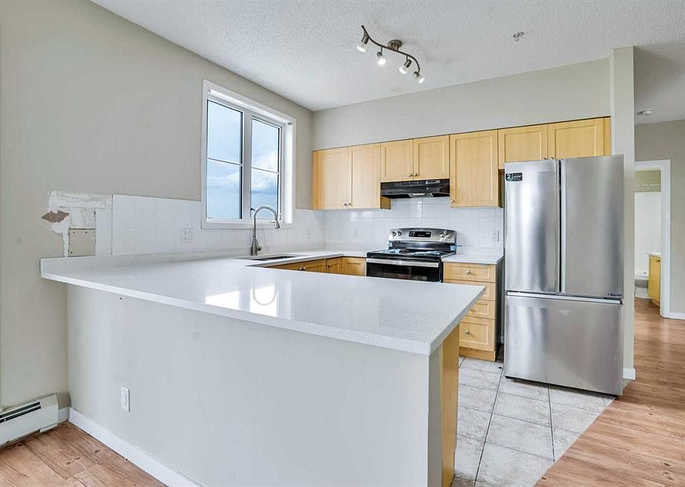 Amazing value for an amazing amount of space in this bright and spacious 2-bedroom plus den, 2 full bathroom corner unit condo! This large corner unit is flooded with natural light and features a larger-than-average wraparound balcony—perfect for relaxing or entertaining. The home is in excellent condition and located in a very clean and well-maintained building. The primary bedroom is generously sized and includes a spotless private ensuite bathroom, while the second bedroom has a convenient cheater door to the second full bath, essentially giving it ensuite access as well. A bonus den area offers the perfect spot for a tucked-away home office. The large kitchen is outfitted with maple cabinets, brand new quartz countertops, and brand new stainless steel appliances including a stove, fridge, and dishwasher. Both bathrooms also feature brand new quartz countertops, and luxury vinyl flooring has been installed throughout the living, dining, and bedroom areas. Additional highlights include in-suite laundry, a separate storage locker on the same floor, and a surface parking stall. Located close to major schools, shopping, Genesis Centre, train station, bus stops, walking trails, parks, and playgrounds—this unit combines space, style, and convenience at an unbeatable price. Don’t miss the photos and 3D tour!