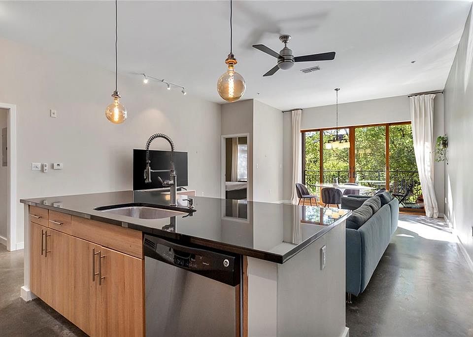 Wonderful one bedroom unit at the coveted Castleberry Point! One of the larger 873 square foot floor plans! Great open layout with the kitchen looking straight into the living room and dining area. Large Anderson wood windows with abundant natural light. Private views with great tree cover. Large open balcony. Master bedroom with walk-in closet and closet system installed. Stunning bathroom with shower and tub. Laundry room closet with storage too! Garage parking spot included. Don't miss the upscale amenities that makes Castleberry Point one of the most coveted communities: roof top pool, multiple grilling stations, clubhouse and fitness center. Multiple restaurants and a coffee shop located in the building. Not to mention the walkability to all that Castleberry Hill has to offer!