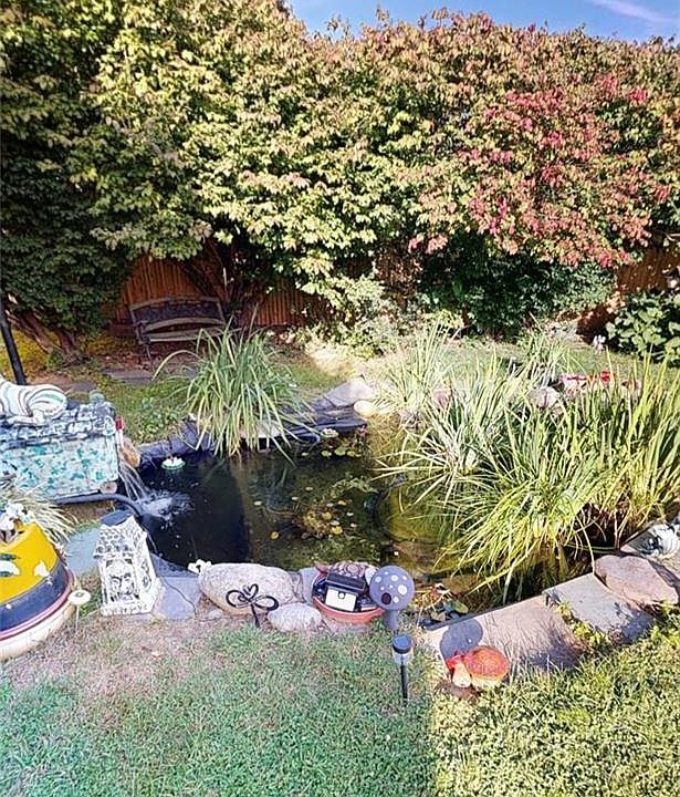 HUGE YARD!!!....KOI POND.....POTENTIAL ADU....BONUS ROOM/OFFICE IN BASEMENT This beautifully maintained home is a truly beautiful piece of property, featuring a 3-year-old roof. Step inside to a warm and inviting layout, perfect for comfortable living and entertaining. A partially finished basement with full bath adds extra space for a potential 4th bedroom or office area. The detached garage includes a half bath (easily convertible to a full bath), a bonus room with kitchen sink and cabinetry, and space for a stove and refrigerator—offering potential for a guest suite or potential ADU (Current owner has not looked into the possibility of ADU). The garage also provides attic storage for added convenience. The sun room provides another wonderful space to relax and enjoy the views. The huge, fully fenced backyard offers a private oasis with stunning landscaping that blooms year-round. Enjoy peaceful outdoor living with a koi pond and waterfall, multiple seating areas, benches and swings, a kids' playset. At the rear of the property, discover a versatile outbuilding with full electric and a propane heater—ideal as a studio, playhouse, workshop, or additional storage. New solar panels provide consistent energy savings. Buyer to assume solar power purchase agreement. NOTE: Pictures show some rooms in progress of being painted. Most will be freshly painted. Text agent for Disclosures, Solar agreement and additional property information.