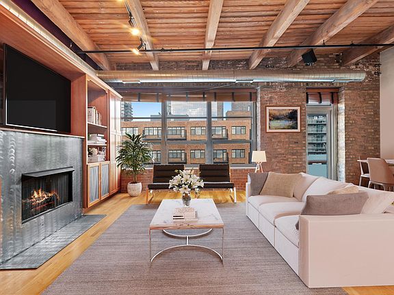 Penthouse level with balcony; dramatic, vaulted ceilings to 20 feet; skylights, bright and sunny; spacious 1100 square foot timber loft; living area with wall of custom cabinets; marble and granite in kitchen and bath; large laundry room w/storage. Walk to Loop and West Loop, great, convenient location. 1 Bedroom Granite Counters Marble Bathroom Custom Bookshelves Hardwood Floors throughout 20 foot ceilings Balcony Gas Fireplace Large Laundry room Gym in building
