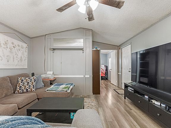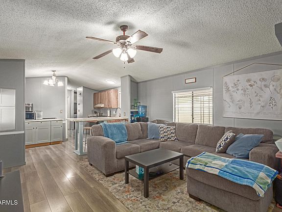 Don't miss this lovely 2-bedroom manufactured home! Close to dining, shopping, and schools! Inside, you'll find wood-look flooring, vaulted ceilings, abundant natural light, and a neutral palette. The nicely sized kitchen boasts ample cabinetry, spacious counters, a breakfast bar, and stainless steel appliances. The main bedroom has a closet and a bathroom for convenience. The screened patio is perfect for enjoying your morning coffee and quiet evenings. The backyard hosts ample space for entertaining and storage sheds for added organization. Hurry up! This one won't last! No HOA, own the land!