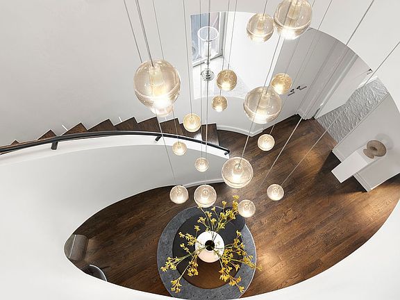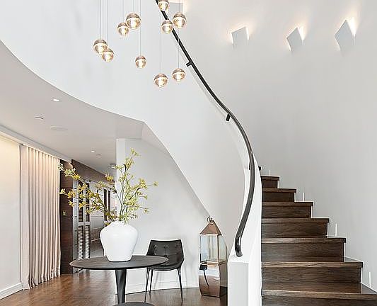 As you enter from the keyed elevator, you’re immediately drawn to the custom-designed spiral staircase, a masterpiece of modern design and craftsmanship. Its sweeping curve forms a dramatic focal point that effortlessly connects two of the penthouse’s main levels. Integrated tread lighting and recessed illumination highlight the staircase’s elegant curvature, while a cascading multi-tier chandelier adds a touch of brilliance.