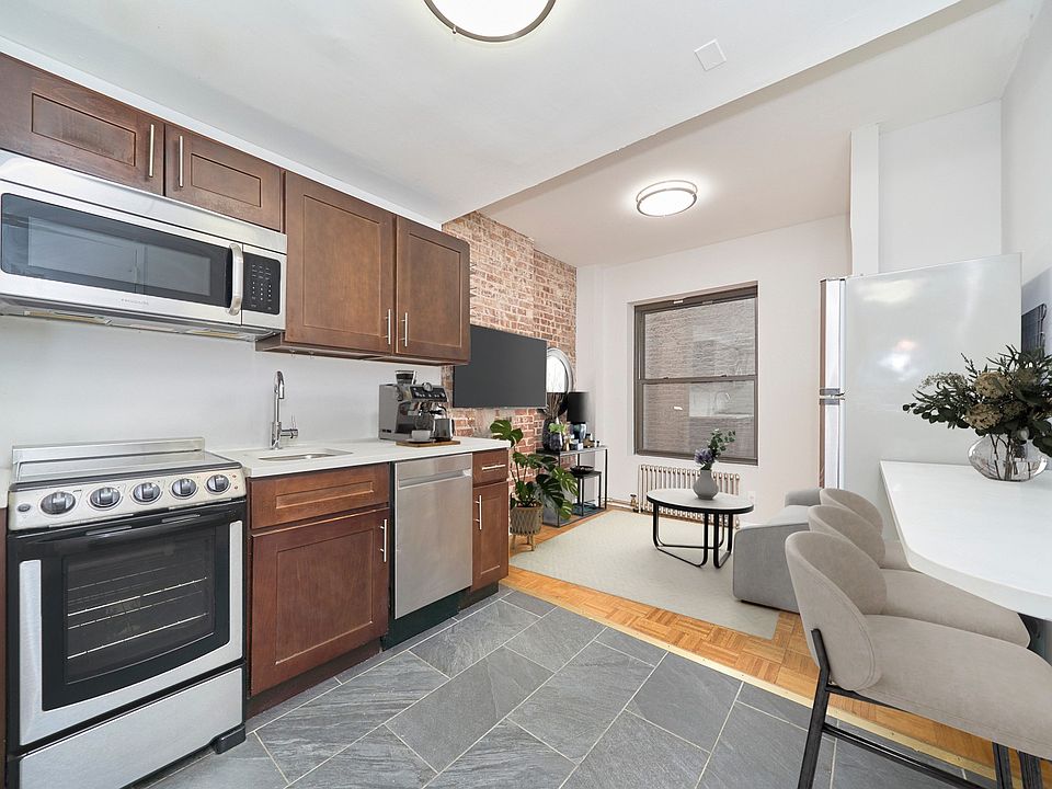 Exposed brickStainless steel appliancesCloset spaceSoak in tubHardwood floor