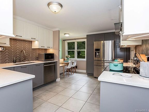 Updated, super-stylish, ranch on 2 pretty acres, located in the center of Avon. This home offers a beautifully remodeled kitchen with new cabinets, quartz countertops, porcelain floor tiles, glass backsplash, stainless steel Samsung appliances, and an chic eating area; a living room with a stone fireplace, bay window, hardwood floors, and sliders to the sun-room; a dining area with hardwood floors; a stunning sunroom overlooking the expansive property (an extra 200 square feet); a master suite with hardwood floors, full bath, and efficient shelving system; 2 additional bedrooms with comfy top-of-the-line anti-bacterial, no stain carpet (hardwood floors underneath); another full bath; attached 2 car garage; and a HUGE lower level with new lighting, and walls coated with DRYLOCK Extreme Masonry Waterproofer. And many energy efficient amenities -- a Lennox Natural Gas Furnace with IComfort digital pad panel that can be controlled remotely (dehumidifies and humidifies as needed), Aquanta "smart" water heater attachment that can be controlled remotely, 2 layers of R19 installation in attic above bedrooms, new attic fan, an electric leak detector, central air and 200 electrical amps. Such a special home. Come for a visit; you may just decide to stay!