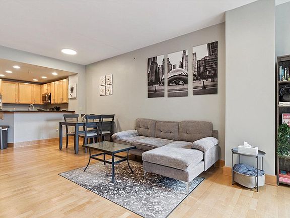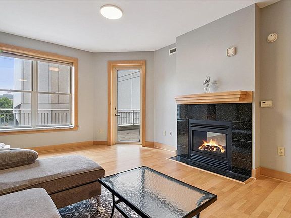 Spacious 4th-floor 1 bed / 1 bath + den condo just steps from Capitol Square! Enjoy an open-concept living area featuring spacious living room, oversized windows, and walkout access to a large private patio?perfect for entertaining. The bedroom/living room offers its own gas fireplace, generous natural light, and a walk-in closet with a custom built-in drawer system. A versatile den provides the ideal spot for a home office or lounge area. The unit also includes in-unit laundry and a spacious bathroom with a soaking tub. The unit is conveniently located near the parking garage and storage unit. Building amenities include a fitness center and a stunning rooftop green space with city views.