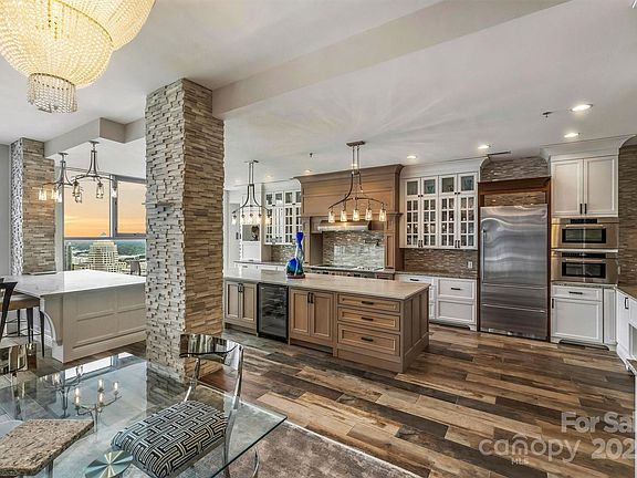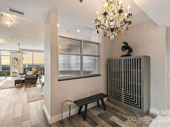 Perched on the 27th floor, this condo offers a rare 270-degree panoramic view that captures the Charlotte skyline, the mountains to the north, and direct sightlines to Truist Field and Bank of America Stadium to the south. Featuring soaring ceilings and floor-to-ceiling windows, this 4-bedroom, 5 full-bath residence was designed for both everyday luxury living and elevated entertaining. With designer finishes and fixtures that were curated throughout with no detail overlooked this residence seamlessly blends modern luxury with architectural sophistication—an offering that is truly irreplaceable in Charlotte’s current market. There are two expansive balconies, a primary suite with marble-clad spa bathroom, custom personal gym, and a chef’s kitchen with dual islands, Wolf and Sub-Zero appliances, custom cabinetry, quartz and granite countertops. This condo also offers FIVE deeded, secure parking spaces and an additional private storage room.