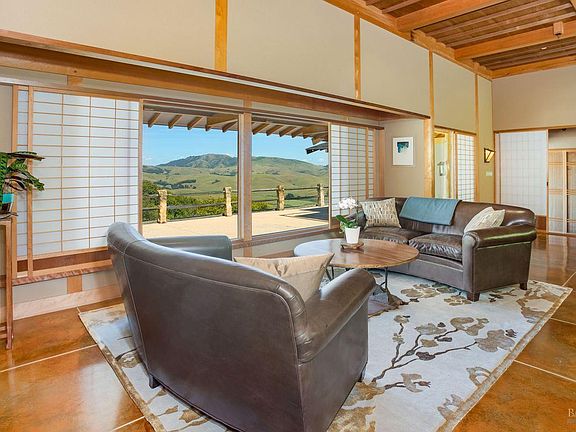 From the sun-drenched slope of Black Mountain in coveted Nicasio overlooking its gorgeous reservoir, West Wind Estate and Winery combines Northern California wine and food culture with Japanese philosophy for true Zen ambiance. Enjoy privacy and simpler living w/ no detail spared, including an unsurpassed infrastructure that encompasses a solar array, abundant well and spring water, private roads, ancillary buildings, and deep wine cave. Necessary agricultural and wine-making equipment to run the 32-acre ranch is included. Meticulously designed and constructed to last a lifetime, every inch of the main residence and detached guest residence combines traditional Japanese techniques with modern engineering. The effect is stunning in both aesthetics and execution, from the cherry hardwood floors to the ceilings of wide-plank cedar, customized by room throughout both homes. Sanctuary beckons from the spectacular interiors to stunning natural grounds. Recreation reaches new heights with a 50,000-gallon spring-fed pool and Bocce court. Experience a breathtaking blur between indoors and out, where walking paths connect formal gardens, organic orchards, and two acres of vineyard that only scratch the surface of the splendor this estate has to offer.Some photos have been digitally staged.