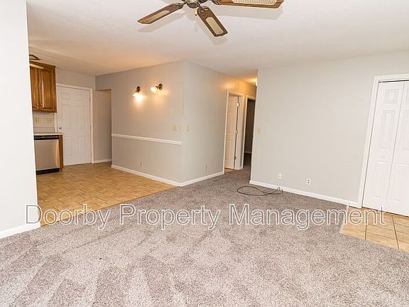 Step inside to a carpeted living room that flows directly into the open-concept kitchen. The kitchen includes a stainless steel refrigerator, range, and dishwasher, along with space for a small dining table.