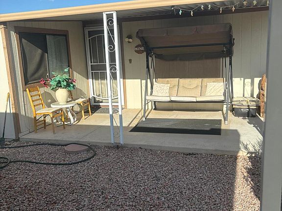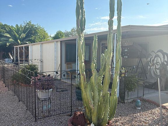 A lot of new in this 3 bedroom 2 bath doublewide that the third bedroom has an outside entrance for possible Care taker services or mancave., with an AC. New flooring, heater core and roof is only 5 years old. Freshly painted inside and out. Possible furniture to be left. There is also a inside Arizona room currently an office/craft room. Endless possibilities and Amenities in a small 55 plus community. The actual square footage does not include the extra10 x 24 Arizona room and the 12 x 26 mancave/ caretaker room.
