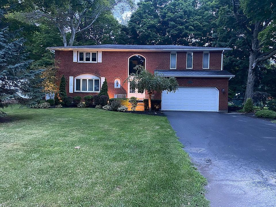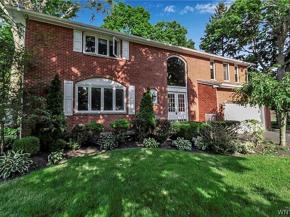 Large 5 bedroom home in lovely Woodland Heights neighborhood of Town of Niagara in Niagara Wheatfield school district. Spacious living room and connected dining room (with hardwood floors under current carpet). Half bath downstairs. Roomy eat-in kitchen with newer JennAir and Samsung appliances included. Cozy sunken family room with fireplace which opens onto back patio and beautiful park-like fully-fenced back yard. Attached 2 car garage and shed in the back. Full height, unfinished, dry basement. Air conditioning provided by two Mitsubishi split units - one upstairs, one downstairs. Well maintained throughout with electrical upgraded in 2022 and many newer windows. Master bedroom upstairs has a bathroom that was roughed in with plumbing but is not finished. 5 good-sized bedrooms, large landing area, and full bathroom upstairs.