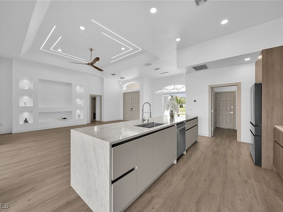 This beautiful 3-bedroom, 2-bathroom modern-style home offers nearly 2,100 sqft of living space in Burnt Store area one of the most desired areas in Cape Coral. The property provides ample space for a future pool. Less than 5 minutes from future 7 ISLANDS Hotels, Restaurants and Marina Development. The home is newly fully fenced. You will find high-end finishes throughout, including brand new modern appliances, new modern cabinets and Taj Mahal Quartz island and bathrooms. Home features a brand new A/C system, a new Full-House Reverse Osmosis water filtration system with maintenance included for 1 year, a new metal roof, new floor, new driveway, garage floor and lanai floor, new bathrooms, security camera system, zebra privacy curtains and much more. House was fully renovated inside and out to the detail by owner. This is a good opportunity for AirBnB investors.