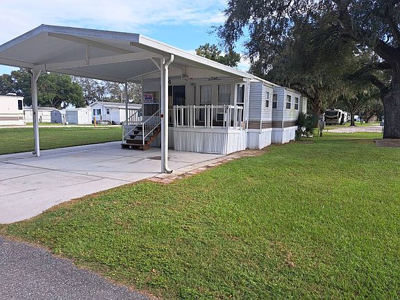 Located in a very active 55+ RV Resort with pool, shuffleboard, clubhouse and so much more. Close to shopping, restaurants and medical facilities, plus easy access to Tampa, Orlando, Plant City, Dade City, etc. This home is located at the back of the resort and in a very quiet area. With a large two car carport and a lovely porch to enjoy the weather, plus a large open patio in the back for BBQ area, this is a very nice home for the price. The interior has a very spacious attached Florida room with two air conditioning units and surrounded by windows for a lovely view and great natural lighting. The main home has a very quaint dining or den area with a fireplace and also several windows for more light. An open kitchen with more seating area that has a gas stove and microwave plus full size refrigerator has plenty of cabinet space as well. The bathroom has a new sink and a tub/shower. The roof is a TPO/rubber with a long life-span. The three window a/c units are new and keep this home nice a cool. Florida room has been painted with new carpet. This is a great home in an active RV resort and won't last long. One of the largest homes in this community. Call now for an appointment to see in person.