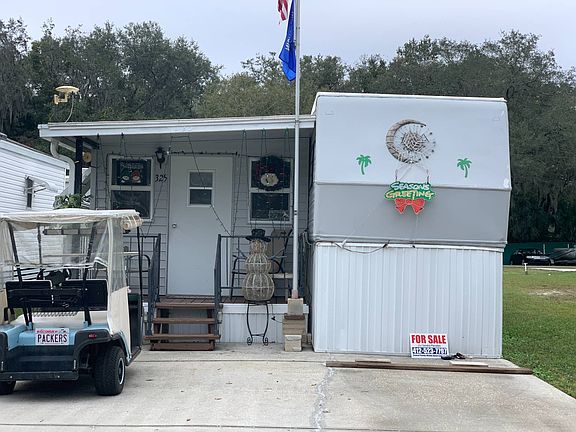 21+/1989/1BD/1BA/400 SQ FT PLUS ADDITIONAL 395 SQ FT FLORIDA ROOM/LAMINATE FLOORING/NEW COUNTERTOPS/NEW STOVE/NEW REFRIGERATOR AND MICROWAVE/A driveway with room for two vehicles, as well as a front deck porch welcomes you to this beautiful 400 square foot main unit with an added 395 square foot Florida room totaling 795 square feet of living space, perfect for a snowbird or full time residence. The golf cart you see pictured is NOT INCLUDED in the sale but is available for purchase. There is a back patio as well with the shed located just off this patio. The shed is very roomy and has plenty of storage space as well as the washer and dryer. The Florida room is being used now as the main living area. There is another room just off the Florida room that is a perfect bonus space for whatever your needs may be. There is a second refrigerator in this room that is included in the sale. The transition from the Florida room leads into the open living and kitchen space. The kitchen has new upgrades done in 2020 with countertops, refrigerator, microwave, cabinets, and a propane stove. The bedroom has built-in closet unit and drawer space. The bath has a single sink vanity and step in shower. Located in the pet friendly and people friendly community of Palm View Gardens, there's a year round vacation vibe and many amenities for residents including recreation hall, library, heated pool, craft building, shuffleboard, stocked lake for fishing, bingo, dances, and much more. You'll have easy access to all of Tampa Bay, the beach areas, and downtown Tampa, as well as the resorts of Orlando and Legoland, but all tucked back in the peaceful country atmosphere of Zephryhills where you will find plenty of local shopping, dining, festivals, nature areas, and medical facilities. This one is really priced to sell and will not last long. Call today and make an appointment for your showing! New Year! New Home! New Adventures!