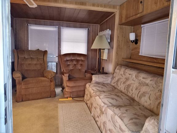 Located in an active RV community near the heart of Zephyrhills with restaurants, shopping, medical facilities and movie theatre. This home is a fixer upper with great potential to be a very comfortable home. The attached Florida room is surrounded by windows and has a large indoor shed/laundry area. Plenty of storage with a washing machine. There is also a large shed in the back of the property with a small open patio. Entering the main home is an open floor plan with a small dining area and kitchen. The kitchen has an extra long countertop with newer cabinets, full size refrigerator and newer water heater. There is no stove since it has been covered to make the space for the longer countertop and cabinets. There are lots of storage areas throughout this home and once upgraded will make a comfortable home to live full time in our Florida weather. Some handy work is all that this home will need; new carpet, deep cleaning, some minor repairs. Call now to make an offer!