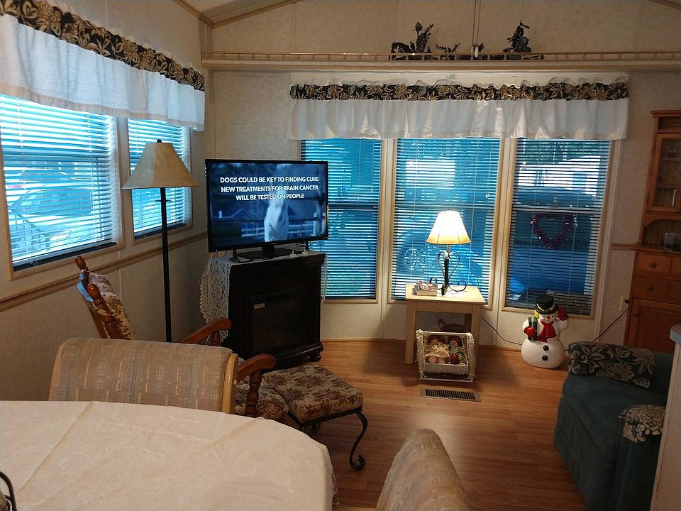 PRICE REDUCED!! Located in Palm View Gardens a 55+ RV resort community with plenty to keep you busy. Close to shopping, restaurants and more. This lovely home has a carport in front with an exceptionally high roof area and a wonderful open air patio in the back of the house for entertainment and BBQs. As you enter, there is a very comfortable sized Florida Room with two sofa beds for extra sleeping accommodations. The main house has an open floor plan with plenty of decorative cabinets and storage space. Such a nice area to spend time. The vaulted ceilings and many windows give this home a very comfortable and spacious feel with plenty of natural lighting. The kitchen has track lighting and nice counter space to work. Ceramic, flat top stove with overhead microwave and full size refrigerator included. Full sized bath room with tub/shower and so nicely decorated. The bedroom fits a queen size bed and has so much storage and closet spaced, it is amazing and wonderful! There is also a complete laundry room with washer and dryer plus a large storage cabinet and extra space to store other items along with more cabinets and shelving. This room opens to the outdoor patio and large storage shed. The roof is a roof over for low maintenance and extra insulation. Air conditioning unit is oversized and maintained on a regular basis. Thermopane windows throughout home as well. BONUS!! Golf cart is included and maybe even a couple of tricycles!! This is a lovely move in ready home, you will not be disappointed. The lot rent is also very low at $395 per month includes all amenities at the park plus water/sewer, lawn maintenance and garbage. Call now to set an appointment and see what I am talking about. Don't wait!! GREAT PRICE AND JUST REDUCED!!!