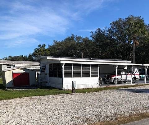 REDUCED, LOW PRICE! Located in a 55+ RV Resort with lots of amenities for your entertainment and comfortable living. The park has a pool, clubhouse, gym, library, shuffleboard, craft areas and so much more. It also has a dog park under some beautiful trees. The home is located on a corner lot with plenty of yard space surrounding it. There is a covered carport and a lovely enclosed patio that has vinyl windows and screens for a wonderful natural setting and able to see a spectacular sunset each evening. This is a travel trailer style and is fully furnished. Very comfortable for a single person to relax and enjoy our Florida weather. Please confirm with Management that the lot rent has an annual rent of $495 per month, but also has a 6/6 configuration that is less expensive to pay for a winter home. Call soon to see this home at a great price. Electric bike included in new low price. Call now!!