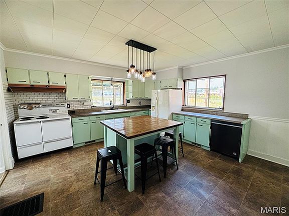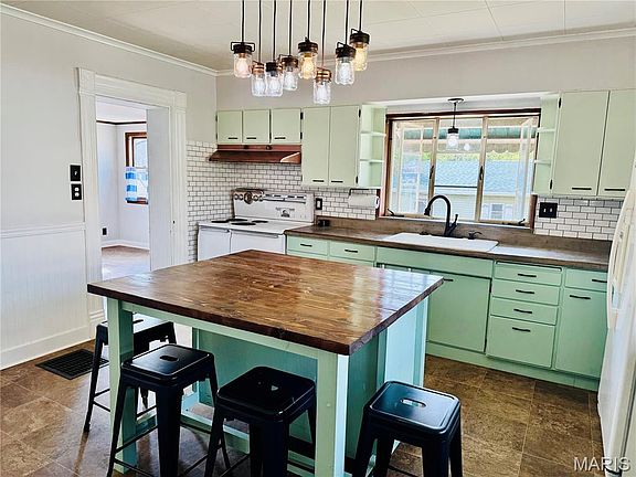 Bursting with character, charm, and architectural detail, this stunning 1890 home is a true showcase of original craftsmanship—featuring intricate woodwork, detailed moldings, and timeless design. With 3+ bedrooms and 2 full baths, it beautifully blends 19th-century style with modern comfort. The updated kitchen and contemporary bathrooms offer today’s conveniences while preserving the home’s historic appeal. Step through the front door and be welcomed by a grand two-story entrance, highlighted by a graceful staircase, vibrant wallpaper, and chandeliers. Tall ceilings and tall windows fill the spacious living and dining rooms with natural light, creating a warm and inviting atmosphere. The kitchen is the heart of the home—featuring a large island with seating, wainscoting, a cast iron sink, subway tile backsplash, and pantry. You’ll love the hinged casement windows that swing outward, adding charm and character. Off the kitchen, a sunroom provides the perfect spot for a breakfast nook or home office. A full bath with tile shower and glass doors also includes the washer and dryer for convenience. The primary bedroom is located on the main floor and features some exposed brick. Upstairs, you’ll find 2 additional bedrooms and an updated bath with a soaking tub, vanity, and built-in linen cubbies for towels. Off one of the bedrooms is a large bonus room—ideal as a dream closet, nursery, office, or even a fourth bedroom. Outside, the charm continues with a covered front porch, white picket fence, and an oversized corner lot complete with a cozy firepit. A detached two-car garage provides ample parking and storage. Throughout the home, the original plaster walls have been replaced with drywall, offering a fresh, updated interior while maintaining the home’s vintage charm. Roof and gutters on the house and garage 2023. Basement access is inside the home, though the stairs are steep, and there’s also an exterior entrance for easy access. This is a must see, schedule you private showing today. #lovewhereyoulive