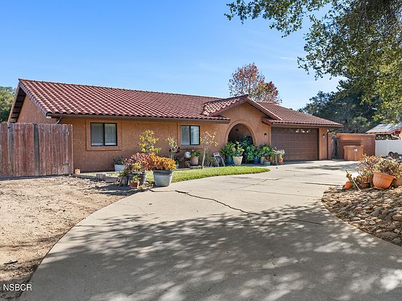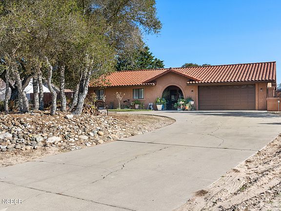 Welcome to this stunning ranch-style home in the highly desirable Mesa Oaks area of Lompoc, offering privacy, ample parking, and outdoor potential in a no-HOA neighborhood. This spacious home features modern updates and unique details, making it a must-see. The large circular driveway provides plenty of parking, with additional RV space in the gated backyard. Set back from the street, the home ensures privacy, and the charming front porch leads to a custom oak tree-designed door. Inside, the open-concept living room features a large window with beautiful backyard views, flowing into a bright sunroom, perfect for relaxing. The remodeled kitchen boasts custom light Cherry wood cabinets and natural stone granite counters, ideal for both cooking and entertaining. An indoor laundry area with ample storage and wood grained tile flooring is also included. The expansive front and backyards offer endless possibilities, including a large concrete stamped deck for entertaining, built-in garden planters, and side yards for storage or RV/vehicle parking. Whether you want a lush garden or an entertainment space, this property has room to bring your vision to life. Schedule your showing today and imagine the possibilities!