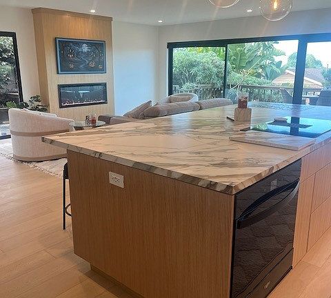 Home is located in a peaceful, mature community, 1.5 miles to Carlsbad Village and beaches. Kitchen has all new, modern appliances, large island, opens to cozy living room with a large wrap around front deck with ocean views; access to new washer and dryer in garage. Gorgeous tropical backyard setting with slate patio, deck, pool, hot tub and waterfall.
