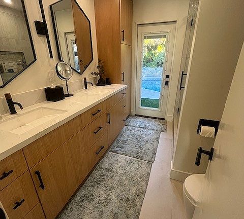 Unfurnished quiet, private room in recently renovated home with new carpet, paint, and views of backyard and pool. Own bathroom with pool access, double vanity, walk-in shower, and tons of storage.