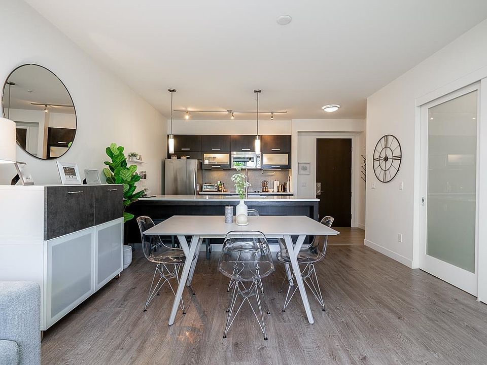 AN ABSOLUTE MUST SEE! A Rare Opportunity to own in one of the Newer Buildings in one of Vancouver's Most Desired Neighbourhoods. This immaculately kept, one bedroom & den is situated on the quiet side of the building & offers a peaceful and completely private setting with west-facing exposure & mountain views. Open-concept living includes an entertainers kitchen with huge island & a conveniently located den that could be used as storage or office. Features include: 9' over-height ceilings, updated flooring in 2018 (high quality white oak laminate), Kitchen Aid S/S appliances, large west-facing balcony with BBQ hook-up, heated bathroom floor & in suite laundry. Parking Included.