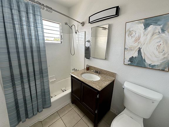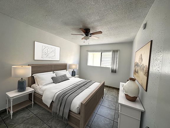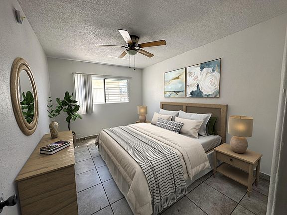 Sleek tile flooringGenerous closet spaceBright natural lightFresh white paintTiled bathroomWide picture windows