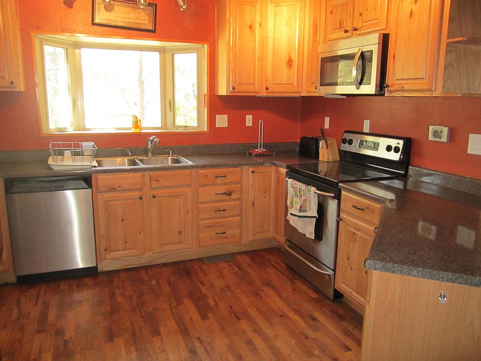 This cozy, 3 bedroom, 2.5 bath home/cabin is nestled nicely on an acre lot with towering Ponderosa Pine trees. This home has been nicely updated with all the modern features. Master bedroom is conveniently located downstairs with a remodeled bath. Kitchen had a complete remodel and has all the modern amenities such as brand new cabinets, stainless cooktop range, built in microwave, stainless dishwasher, and refrigerator. Laundry inside featuring washer and dryer, lots of cabinet storage space, and a sink. Updated windows to dual pane throughout. Real wood floors throughout. Family room features a wood burning fireplace, beautiful mantle and more built in cabinets. Upstairs has 2 additional rooms, another bath and storage or play room. Storage shed and tree house also on property.