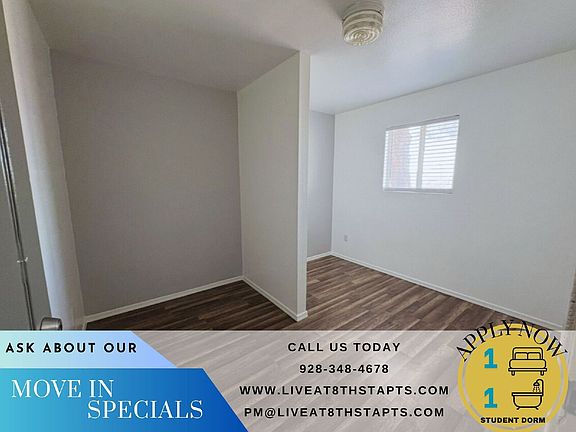 Cool little dormitories for rent! 8th Street Apartments provides quiet living in a neighborhood setting. This complex is surrounded by beauty including an amazing view of Mt. Graham. Your new home would be away from busy streets, yet close to shopping, schools and other amenities. We offer a large range of services and are always here to help. We are conveniently located near important spots such as: Mt. Graham Hospital, Eastern Arizona College, Walmart, and many more. Please take some time to view what we have to offer and fill out an application to get started on renting your own apartment! And don't forget that our tenants receive a free membership to 8th Street Fitness! WIFI INCLUDED