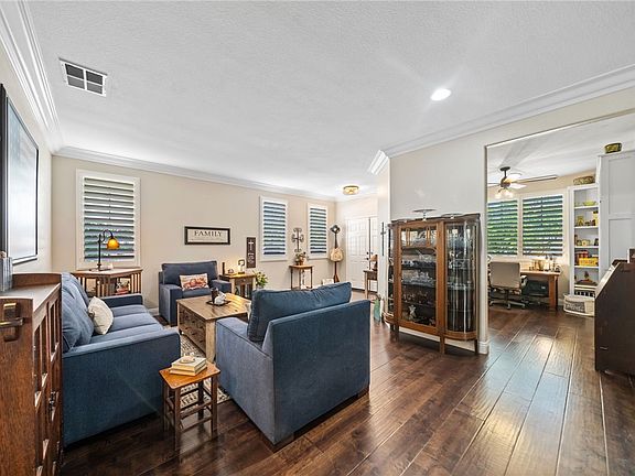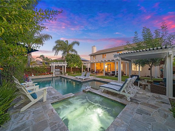 Come home to your own private oasis with this stunning Crowne Hill property featuring lush landscaping and trees, offering privacy and serenity in the backyard. Enjoy relaxing evenings by the fire pit in conversation with friends. The trees are highlighted with ambient lighting to create a magical atmosphere. The end to end alumiwood patio cover provides shade and shelter, making it perfect for outdoor entertainment. The backyard features stunning quartzite natural stone hardscaping and a beautiful pebble tech saltwater pool and spa, perfect for cooling off during hot summer days. Step inside to a spacious and modern interior with a large kitchen boasting quartz counters, Kitchenaid appliances, custom tile backsplash, and under cabinet lighting. All three bathrooms have been remodeled with quartz countertops, custom tile work, and modern finishes, providing a luxurious experience for you and your guests. The living room is adorned with a floor-to-ceiling custom stone wall at the fireplace and a beautiful custom mantel. Custom built bookcases in the office downstairs provide ample storage space, while door casings, updated hardware, shutters, modern lighting, and ceiling fans complete the look of this beautiful property. Don’t miss out on this stunning home that offers privacy, luxury, and tranquility all in one!